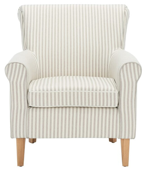 The classic roll arm of the Hazina Club Chair gets updated thanks to a modern beige stripe pattern in a luxurious blend of linen and viscose. St...