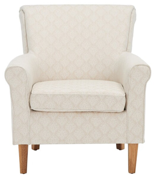 The classic roll arm of the Hazina Club Chair gets updated thanks to a fresh interpretation of a timeless beige damask pattern in a luxurious ble...