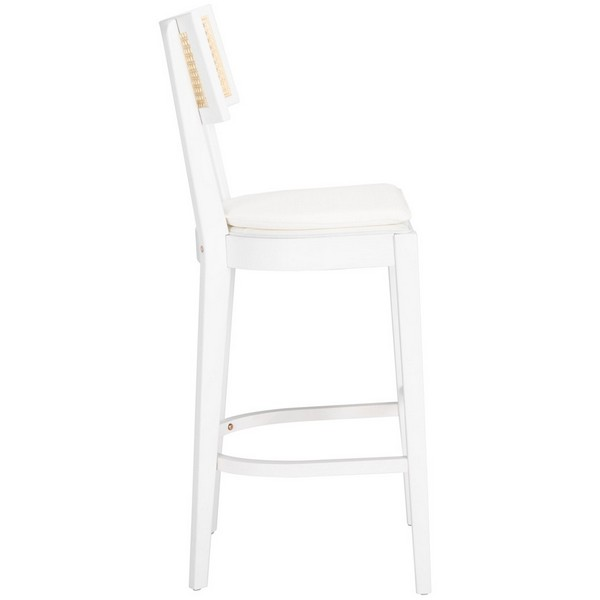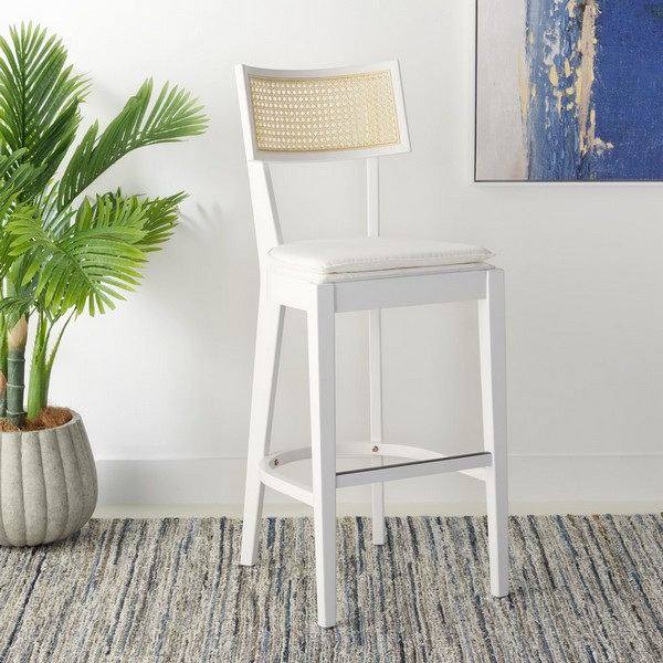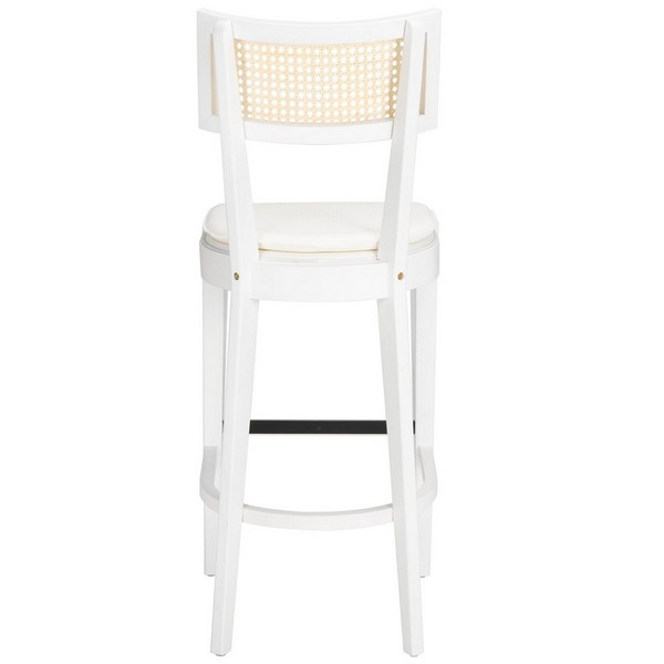 A curved back enriched with woven rattan mesh embraces the body comfortably while a padded cushion ensures a comfy stay. Our barstool features a wood frame enlivened with organic grains to uplift any room with its natural warmth and comfort.