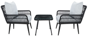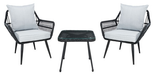 Enjoy your outdoor spaces in style and comfort with our Londyn 3-piece lounge set. It features two charming and playful armchairs along with an accent table. The geometric and eye-catching silhouette of the chair is enlivened with a beautiful wicker weave.